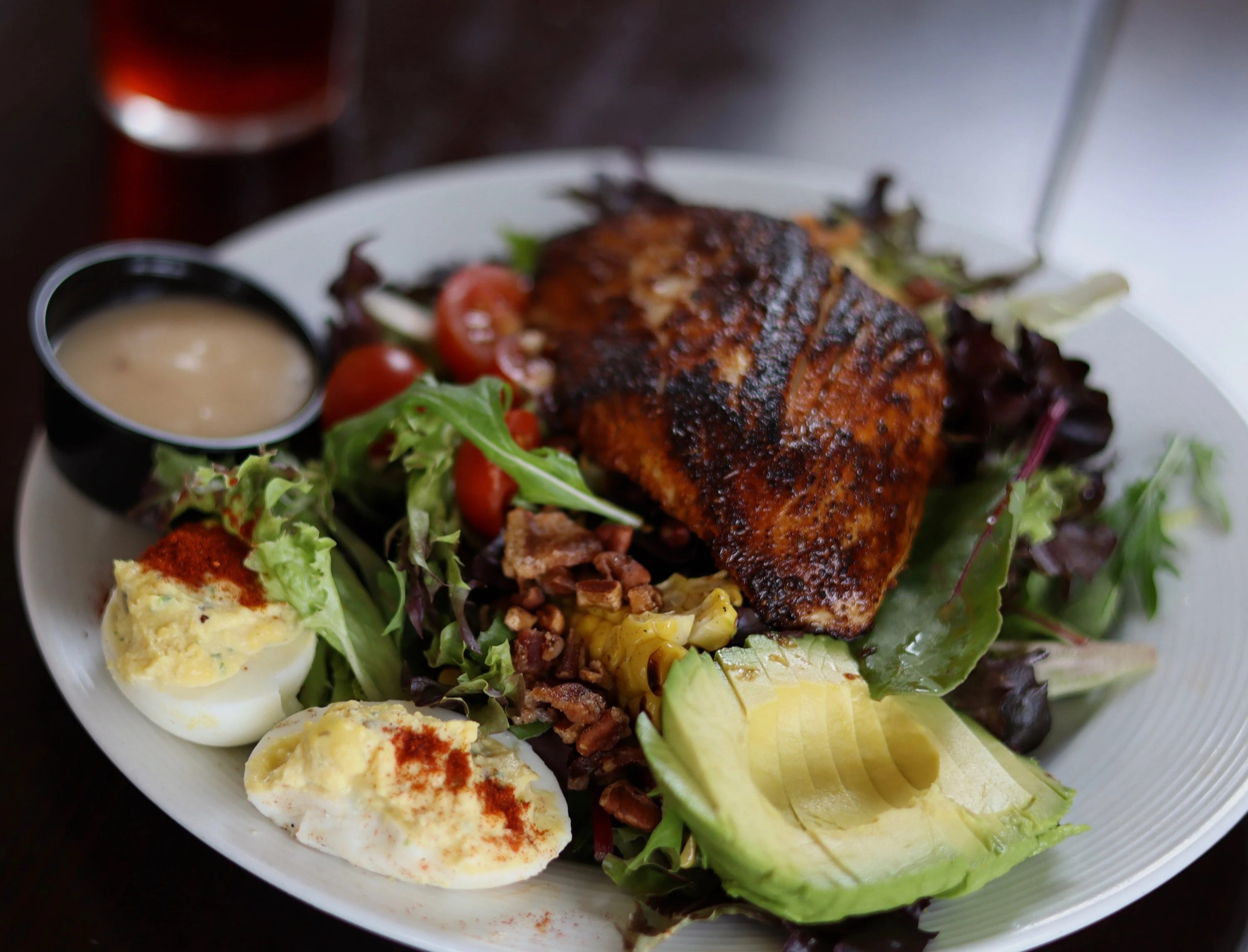 What could make a Cobb Salad even better? Put Blackened Mahi on top. Also including: house greens, grilled cherry tomatoes, avocado, corn, crispy bacon, deviled eggs, spiced pecans and red wine vinaigrette.
