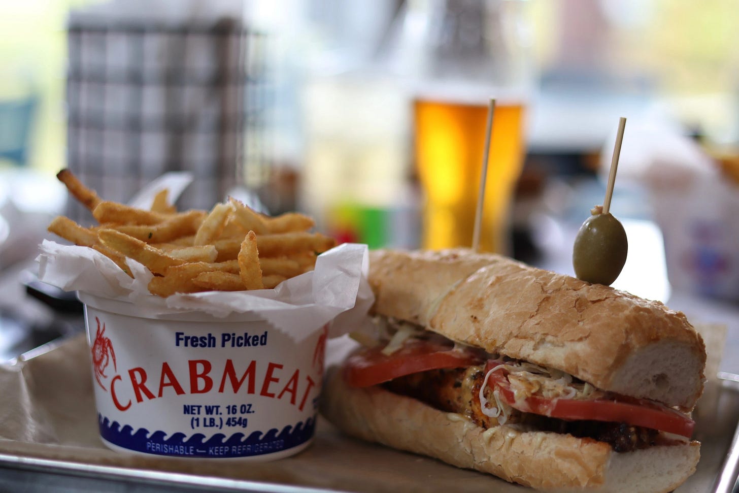 Catch of the Day Po-Boy: Mahi dressed on toasted Gambino’s bread with fries, y’all. Do shoestring fries taste better in a crabmeat container? Yes, they do.